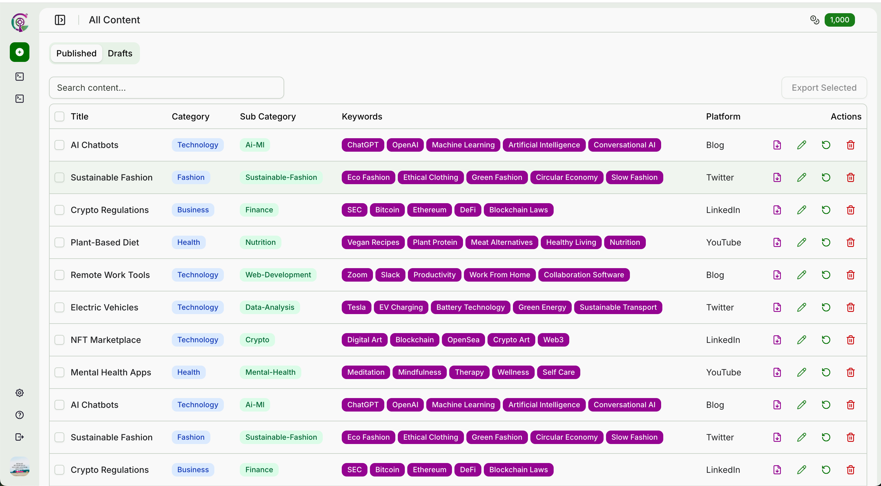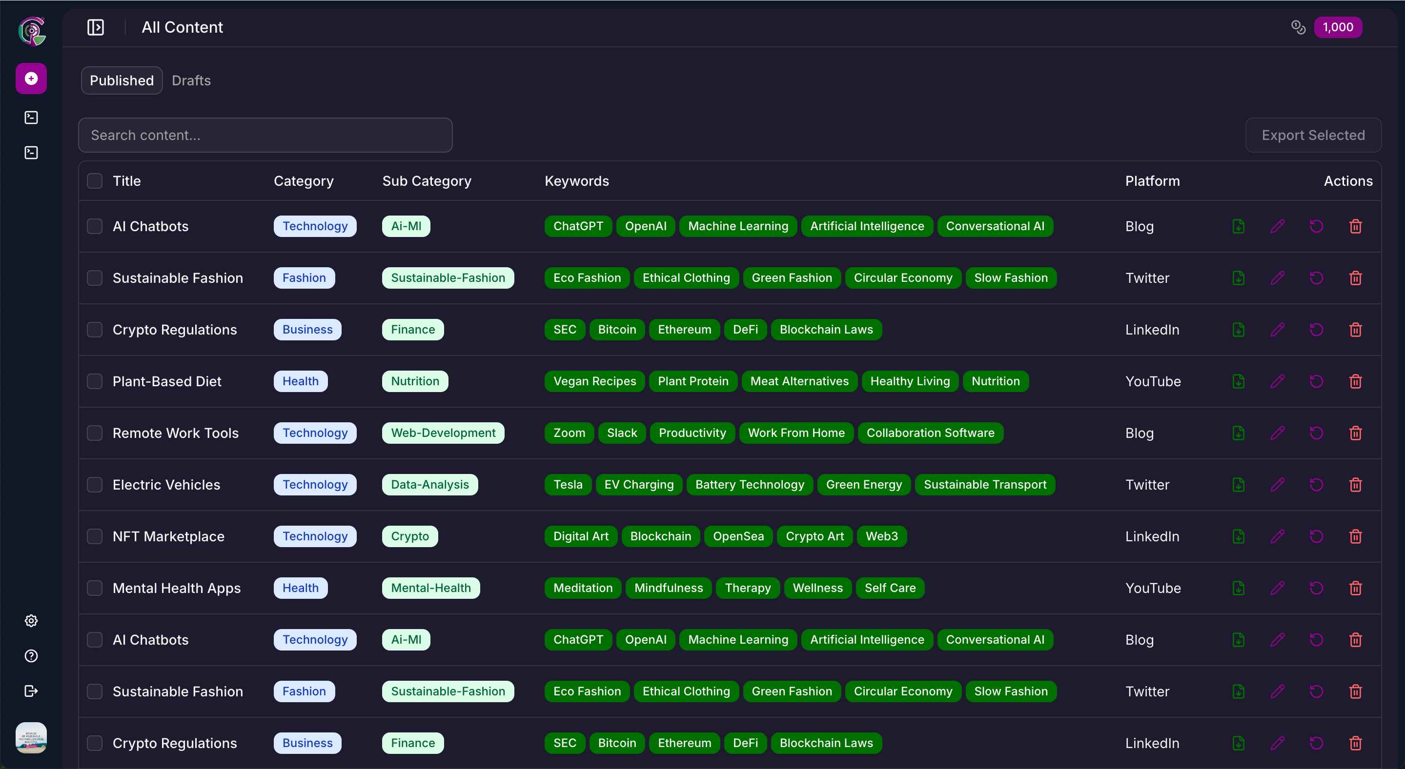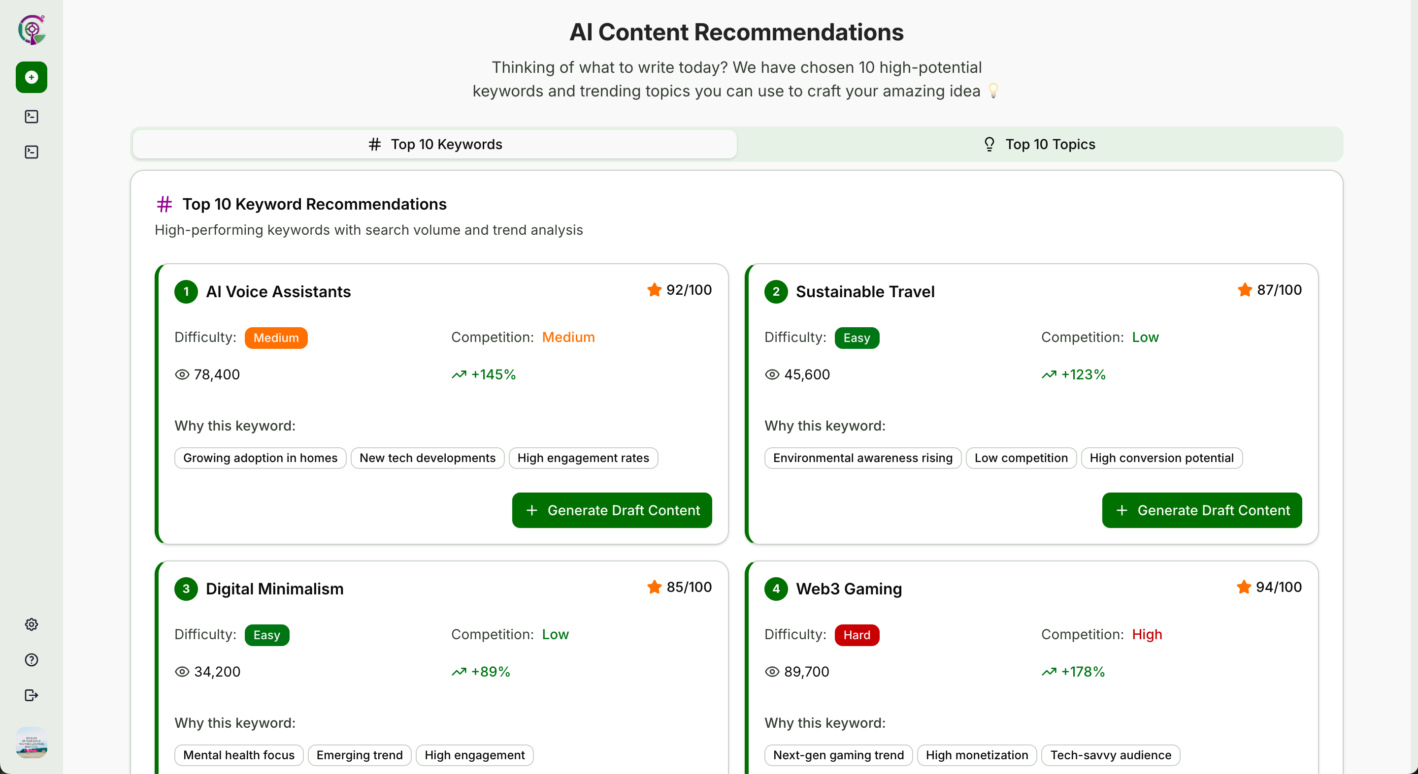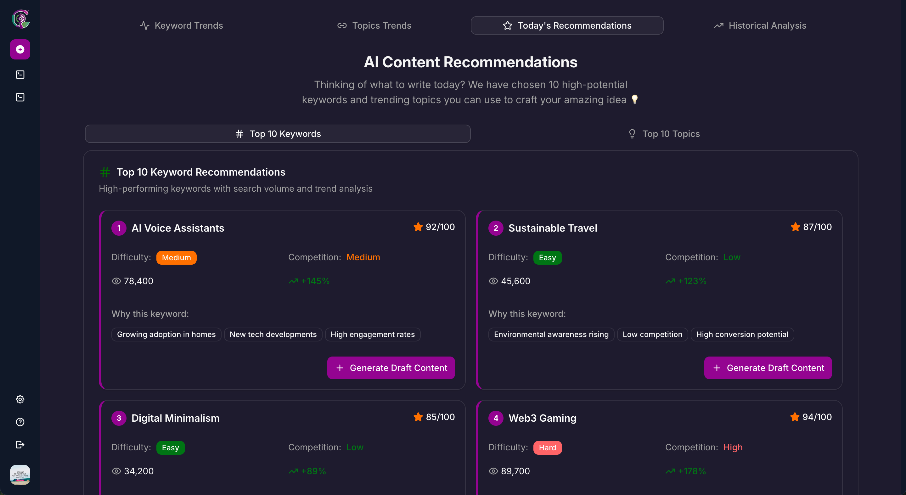 Rira shows you what to write - right now Get fresh topic ideas, titles, and keywords, skip the research and beat writer’s block. Click once to make a draft, edit in the rich editor, and export to any format.
