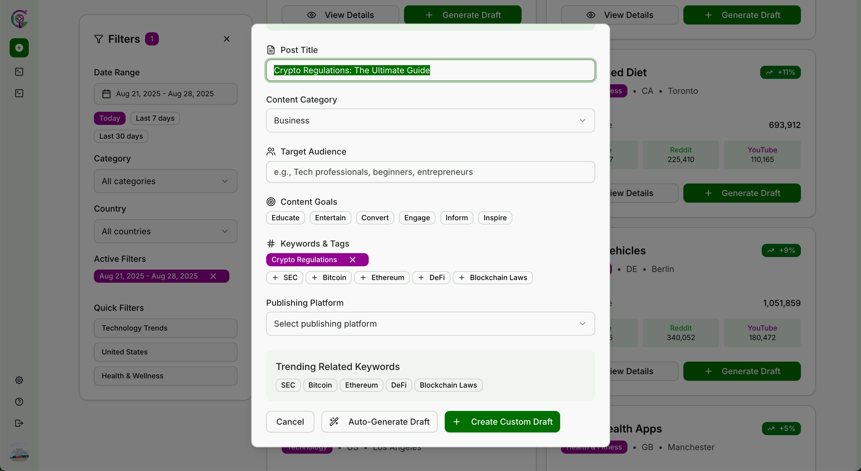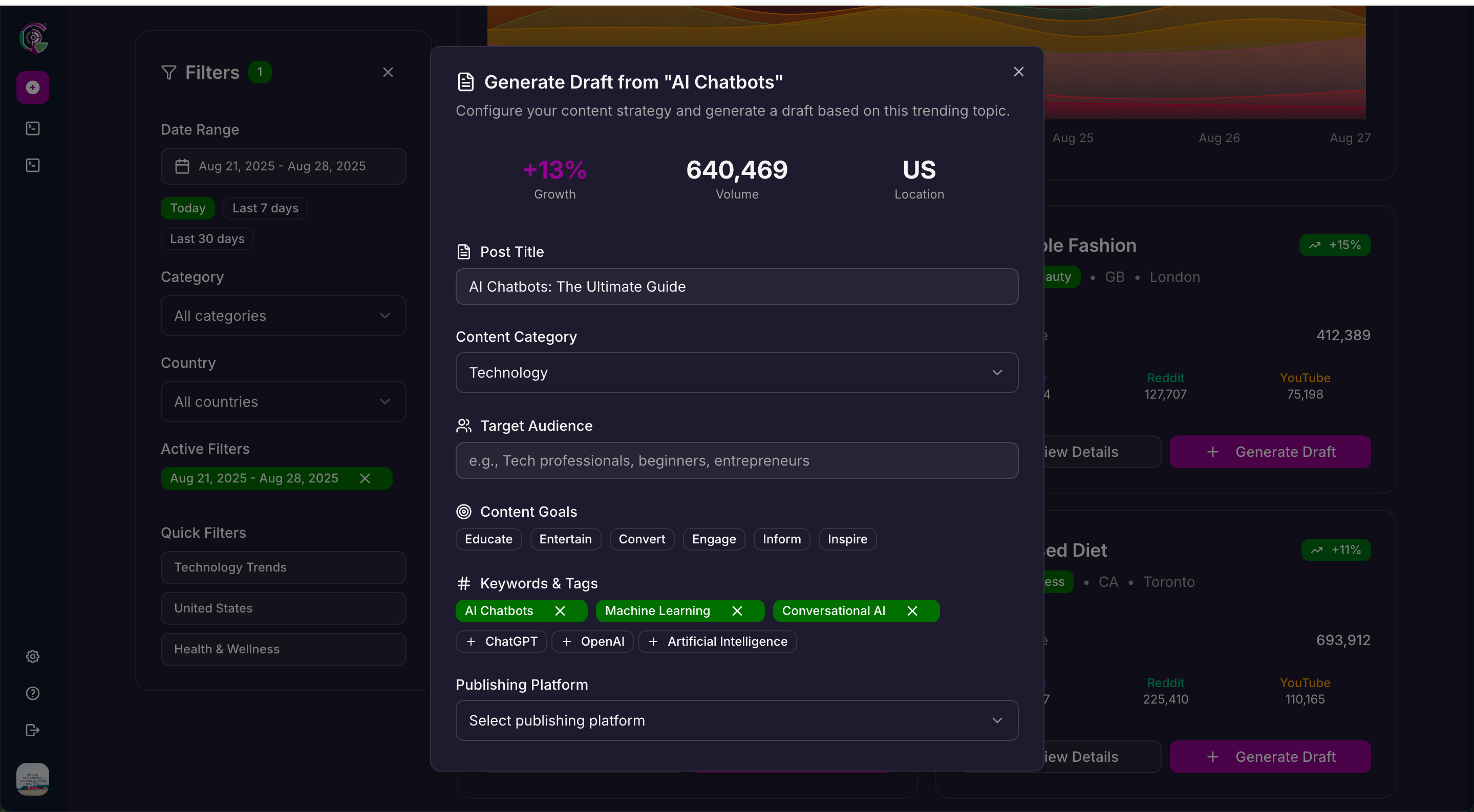First draft in seconds: pick a format → click Generate Draft, change the style → publish.